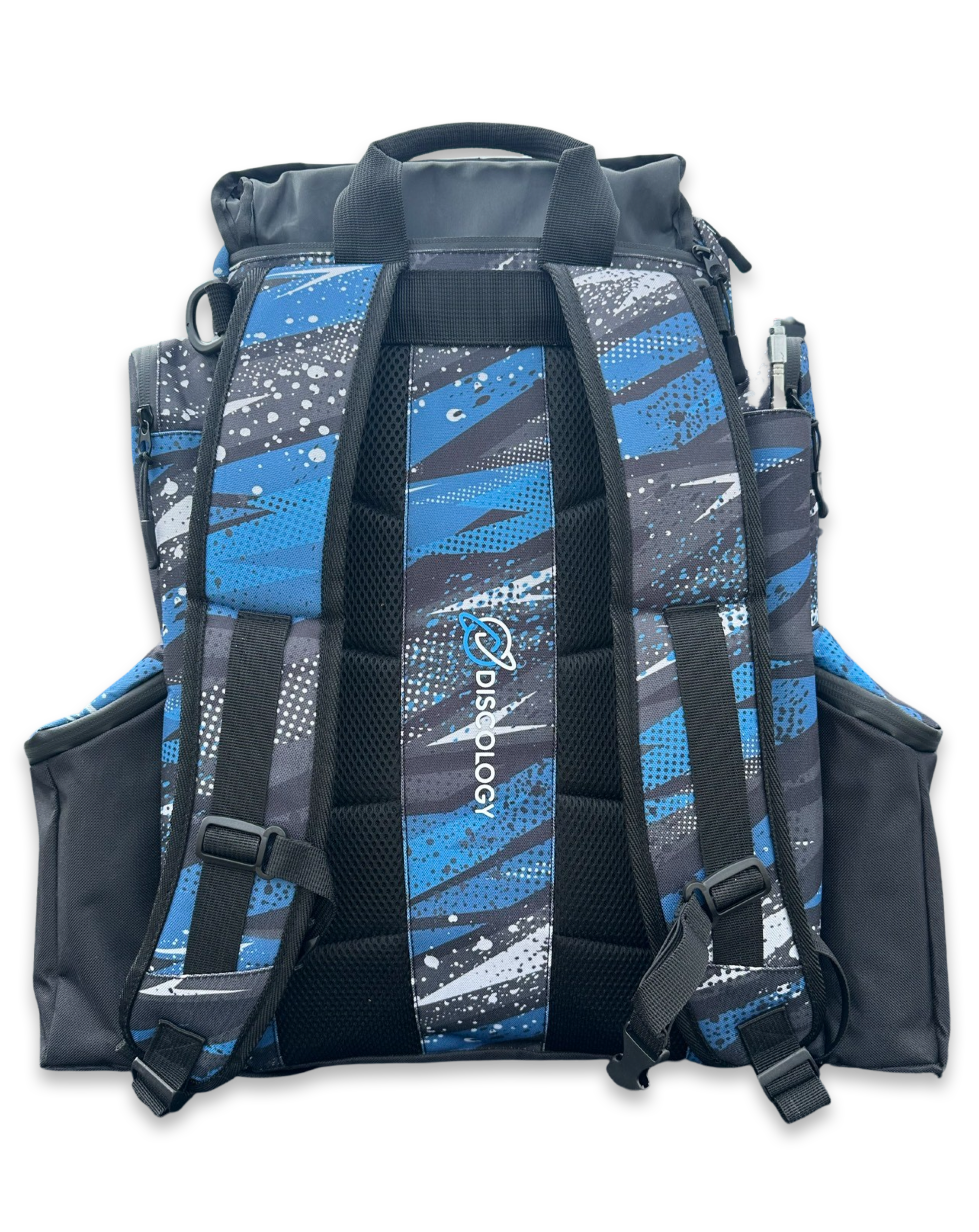- 2 side pockets that can carry discs, water bottles, Nalgene bottles, Phone, Apparel, or whatever else you might need. The left pocket also has a removable bottle divider to keep your bottles upright along with a water bottle holder on the right pocket