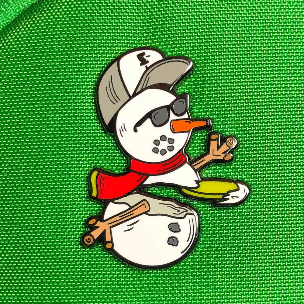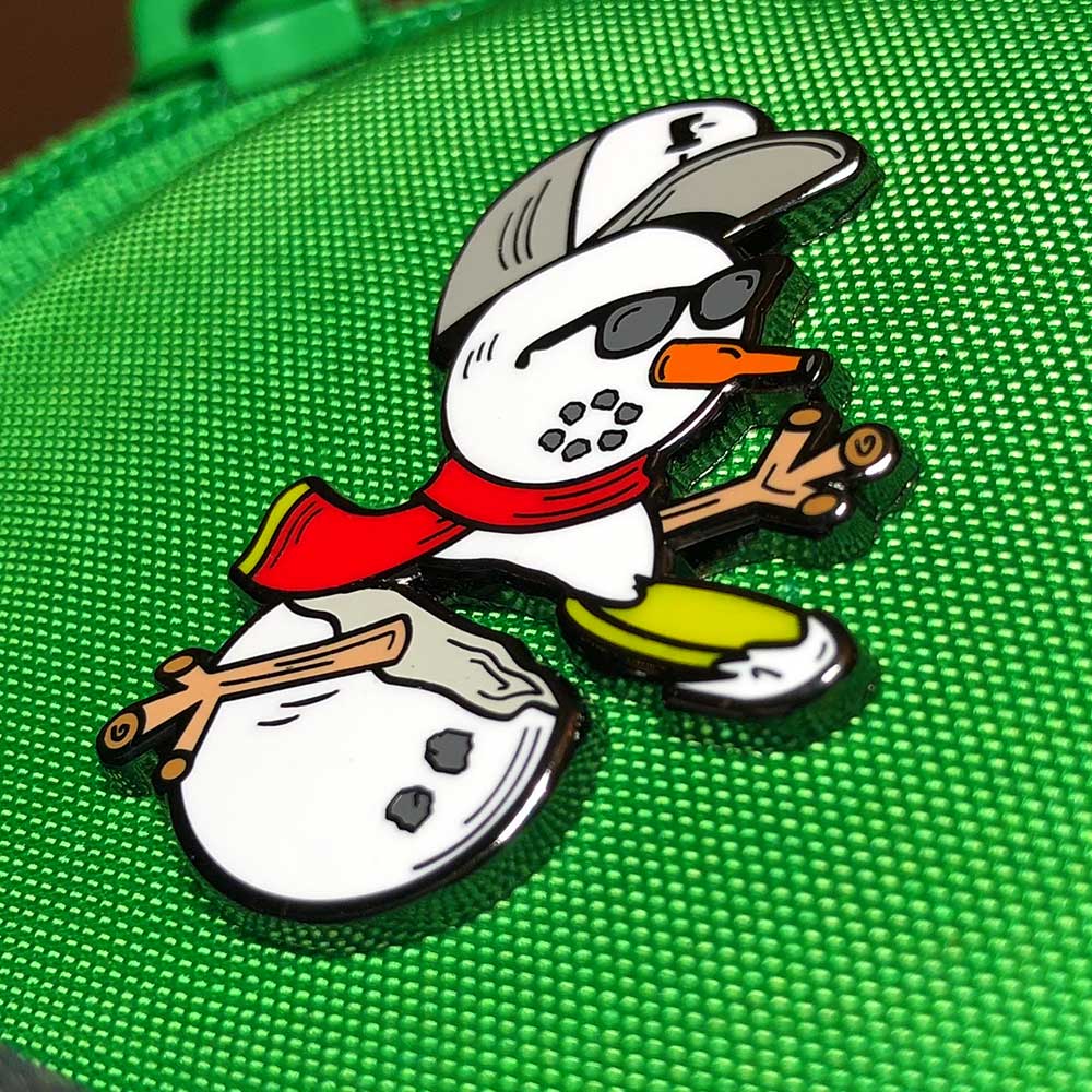 Happy Winter from Disc Golf Pins! No matter what the weather brings this winter, get out there and throw. New color way for the 2022 discin' snowman with his festival red scarf and yellow disc.