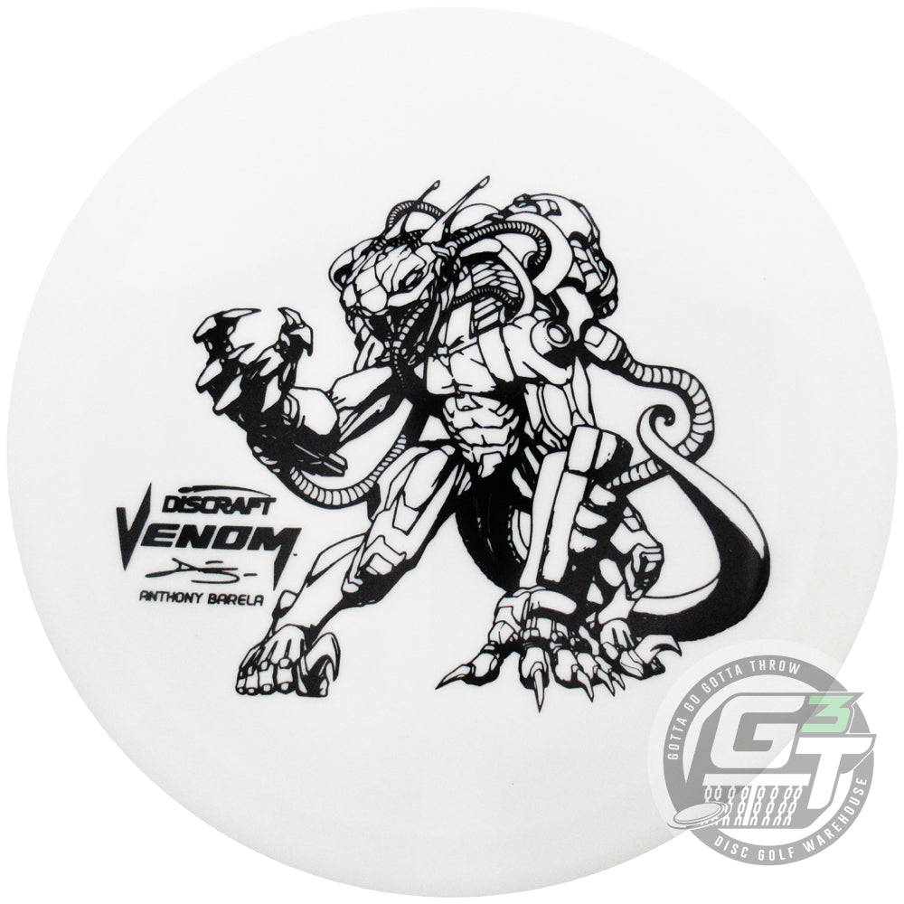 Elevate your game and celebrate Anthony Barela's season thus far with the ESP Glo Venom! This is a disc that not only performs under the toughest conditions but also features exclusive character art for the Venom. Crafted in a premium ESP Glo blend, this disc ensures exceptional grip and durability, even in low light conditions.