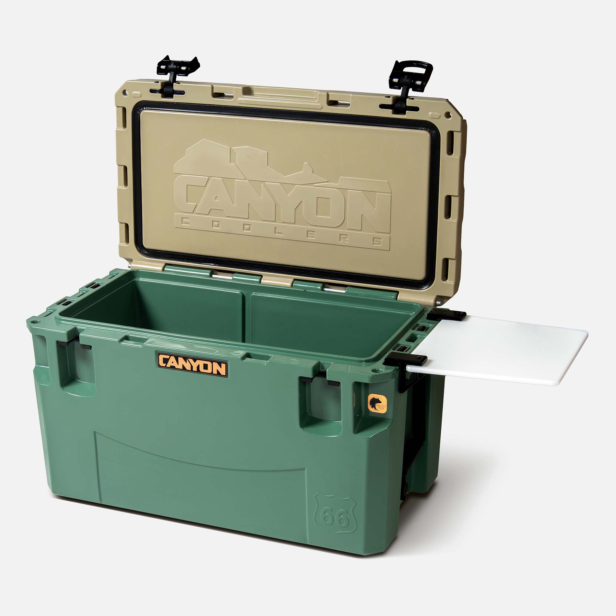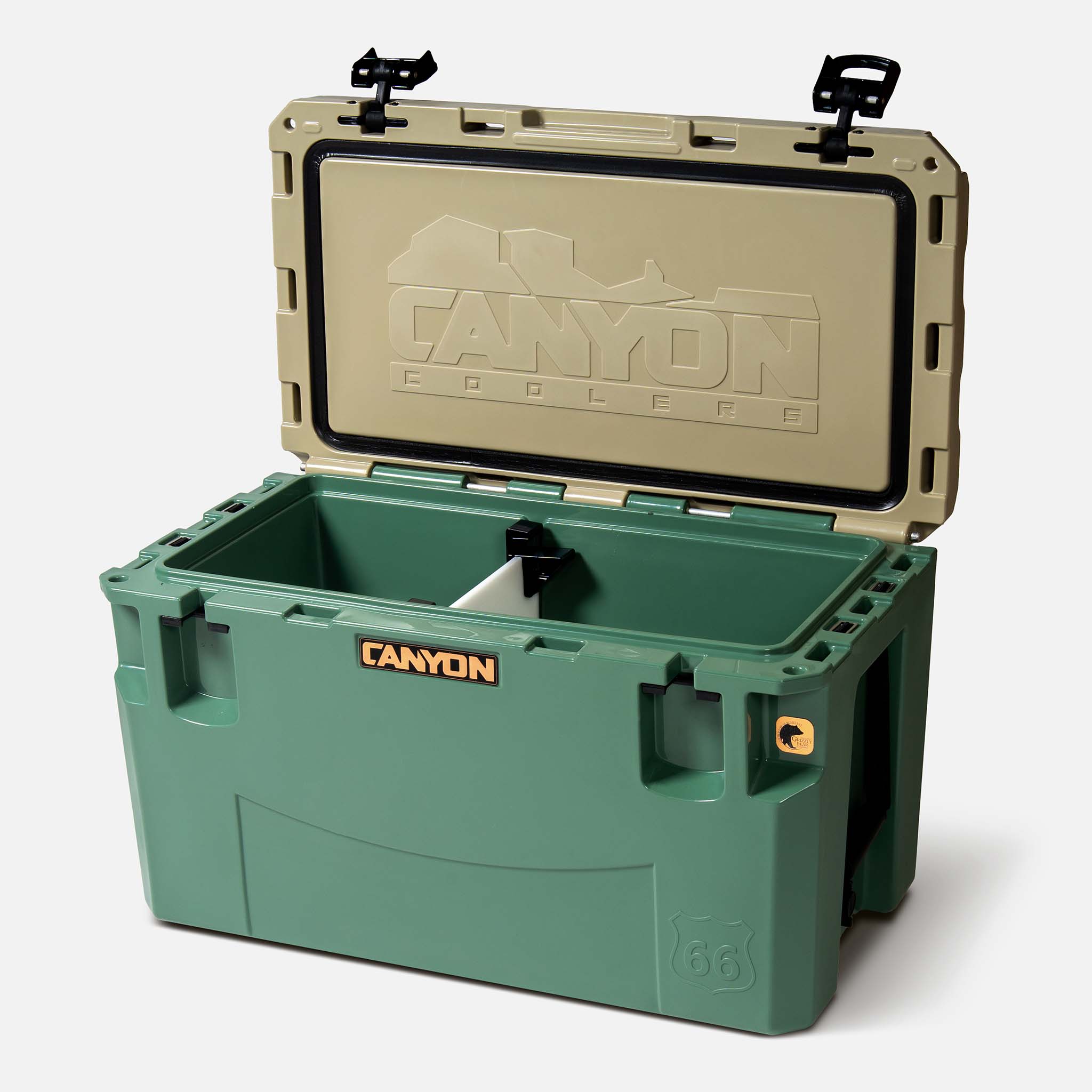 Built for the outdoor fanatic who wants only the BEST, this cooler is ideal for the more rugged adventures. Still moveable when loaded, for most adults, this true 66 quart cooler can hold food and beverage for 4 adults. Engineered and assembled in Arizona with Canyon Cooler's best features: world-class ice retention, oversized latches, and sturdy drain plugs. This cooler even includes a divider that turns into a super-handy, food-grade table that you can attach anywhere on the cooler. And it’s, of course, backed by our no-hassle, lifetime warranty.